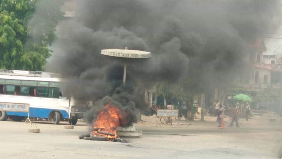 सडकमा टायर बालेर विरोध प्रदर्शन भइरहेको छ । मृतकको शव आफन्तले उठाउन दिएका छैनन् ।