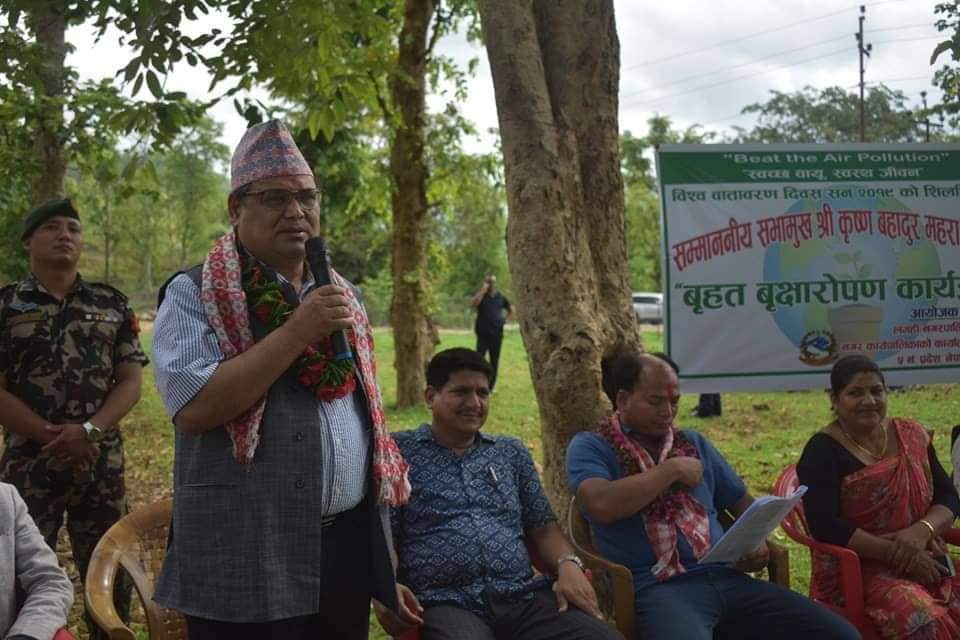 टेक बहादुर पुन,देउखुरी । संघिय सभामुख कृष्णबहादुर महराले दाङ्गको देउखुरी विकासको लागि उच्च सम्भावना बोकेको क्षत्र भएको बताएका छन् । महराले समग्र दाङ सहित देउखुरीको विकास र समृद्धिको लागि आफ्नो अहम भुमिका रहने प्रतिवद्धता जनाएका छन् । दाङको लमही नगरपालिकाले आयोजना गरेको विश्व वातावरण दिवसको अवसर पारेर बृहत वृक्षारोपण कार्यक्रमलाई सम्बोधन गर्दै सभामुख महराले सधै आफु हिड्ने बाटोमा बिरुवा रोप्न पाउँदा खुसि व्यक्त गरे । पछिल्लो समय विभिन्न बाहानामा बन जङ्गल मास्ने प्रबृत्ति बढेको प्रति उनले चिन्ता ब्यक्त गरे । महराले बनजङ्गल जोगाउन सामुदायिक वनका उपभोक्ता नै स्वयम् सकृय हुनुपर्ने अबस्था आएको औल्याएका छन् । सभामुख महराले सँघिय सरकारमा नेपालको वातावरण परिवर्तन बारे बहस चलेको बताउँदै प्राकृतिक सम्पदाको संरक्षणमा एकजुट हुन आग्रह समेत गरे । हरियो वन, नेपालको पहिचान रहेको बताउँदै सभामुख महराले लोपोउन्मुख सतिसालको विरुवा रोपि कार्यक्रमको उद्घाटन गरेका हुन् ।त्यस्तै संघिय सांसद मेटमणी चौधरीले मुलुकलाई हरियालीको रुपमा विकास गर्न देशभर बृहत वृक्षारोपन कार्यक्रमको आवश्यक रहेको भन्दै, मुलुकलाई बलियो र समृद्ध बनाउन बृक्षारोपनको आवश्यक रहेको बताए । यस्तै प्रदेश नं. ५ का प्रदेशसभा सदस्य ईन्द्रजित चौधरीले सन्तुलित वातावरणको निर्माण गर्न र वातावरण जोगाउन हरेक नागरिकको दायित्व रहेको बताएका छन । कार्यक्रममा लमही नगरपालिका नगर प्रमुख कुलबहादुर केसीले दाङको लमही नगरपालिकालाई केन्द्रीय सरकार र प्रदेश सरकारको बजेटले छुन नसकेको बताउँदै सभामुख महरालाई ध्यानाकर्षण गराए ।