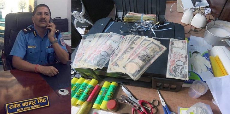 काठमाडौँ । नेपाल प्रहरीको महानगरी प्रहरी वृत्त बौद्धबाट नक्कली नोट बनाउने मेसिनसहित एक गिरोह पक्राउ परेको छ ।महानगरी प्रहरी वृत्त बौद्धमा आएका नयाँ प्रहरी नायब उपरिक्षक (डिएसपी) रमेश बहादुर सिंहले शान्ति सुरक्षा तथा अपराध नियन्त्रणका लागि सुरु गरेको अप्रेशन क्लिन वौद्ध अभियान अन्र्तगत आज सो गिरोह नक्कली नोट र मेसिनसहित पक्राउ परेका हुन् ।सोमबार बिहान ६ बजेको समयमा विशेष अप्रेशन अन्तर्गत काठमाडौँ गोकर्णेश्वर नगरपालिका वडा ६ नयाँ बस्ती विपुल चोकमा रहेको रोशन दवाडीको घरको दोश्रो तलमा भाडामा बस्ने पुथ्वीराज भन्ने राजन परियारसहितको टोलीलाई रगेंहात पक्राउ गरेको डिएसपी सिंहले जानकारी दिए ।सो अवसरमा विभिन्न १६ वटा नोट बनाउने सामग्रीहरु भेटिएको उनले बताउँदै सो बारेमा अहिले थप अनुसन्धान भईरहेको प्रहरीले जनाएकाे छ ।भने उनको एक्सन शैलीका कारण अपराधीहरु त्यस ठाँउ छाडेर अन्यत्रबाट अपराधीक क्रियाकलाप सक्रिय हुने भएको प्रहरीले जनाएको छ ।यसअघि ईलाका प्रहरी कार्यालय कोहलपुरमा कार्यरत हुदाँ गएको पुस १३ गते डिएसपी सिंहलाई घुस दिन आएका ‘गोरु तस्कर’ हेटौंडा–४ स्थायी घर भएका अब्दुल देवान र कोहलपुर–१२ स्थायी घर भएका नवराज थापालाई घुस रकमसहित पक्राउ गरेर मुद्धा चलाएका थिए ।सो प्रशंसनीय कार्य गरेको उनी नेपाल प्रहरीबाट पुरस्कृत समेत भएका थिए । उनले विभिन्न ठाउँमा रहदाँ गरेका उत्कृष्ट कार्य गरेकै कारण स्थनीय जनताहरुलाई “नेपाली सिंघम”! को उपनाम समेत दिएका थिए ।