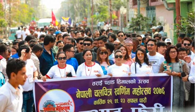 वीरगञ्ज । तीनदिने नेपाली चलचित्र महोत्सव बिहीबारदेखि वीरगन्जमा सुरु भएको छ । नेपाली भूमीमा चलचित्र निर्माण थालिएको ५३औँ वर्ष पुगेको अबसरमा नेपाल चलचित्र निर्माता संघले आयोजना गरेको महोत्सवको राष्ट्रपति विद्यादेवी भण्डारीले उद्घाटन गरिन् । महोत्सव उद्घाटनअघि चलचित्र कलाकारहरु प्रभातफेरिमा सहभागी भएका थिए । घण्टाघरबाट सुरु भएको प्रभात फेरि रंगशालासम्म पुगेको थियो ।महोत्सवले तराई–मधेशमा लुकेर बसेका पात्रलाई मूलधारमा ल्याउने विश्वास आयोजकको छ ।