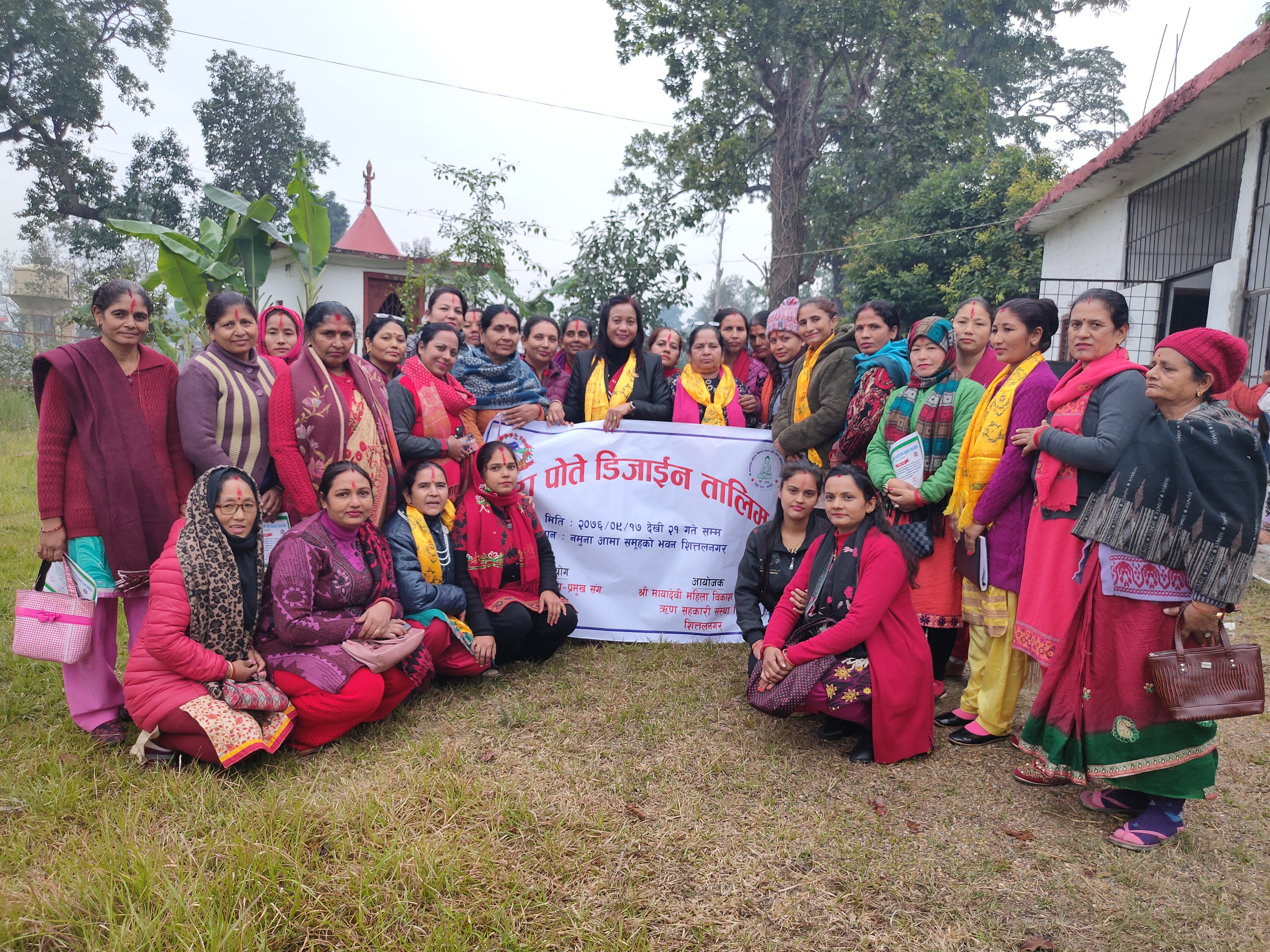 सुरज भट्टराई , देवदह। रुपन्देहीको देवदहमा ५ दिने चुरा पोते डिजाईन तालिम सम्पन्न भएको छ । श्री मायादेवी महिला विकाश बचत तथा ऋण सहकारी संस्था लिमिटेडको आयोजना र देवदह नगरपालिका उप-प्रमुख संग महिला कार्यक्रम , देवदह न.पा को आर्थिक सहयोगमा ५ दिने चुरा पोते डिजाईन तालिम आज बुधबार सम्पन्न भएको हो । तालिम देवदह नगरपालिका वडा नं ७ स्थित नमुना आमा समुहको भवनमा संचालन भएको थियो ।