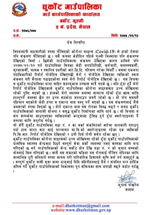 संक्रमित धुर्कोट गाउँपालिका प्रमुख भुपाल पोखरेलले आफैले एक बिज्ञप्ती जारी गरी आफनो स्वस्थ्य अबस्था सामान्य रहेको जनाएका छन् । उनले उच्च मनोवलका साथ कोरोना भाइरसलाई जितेर जनताकै सेवामा फर्किने बताए ।