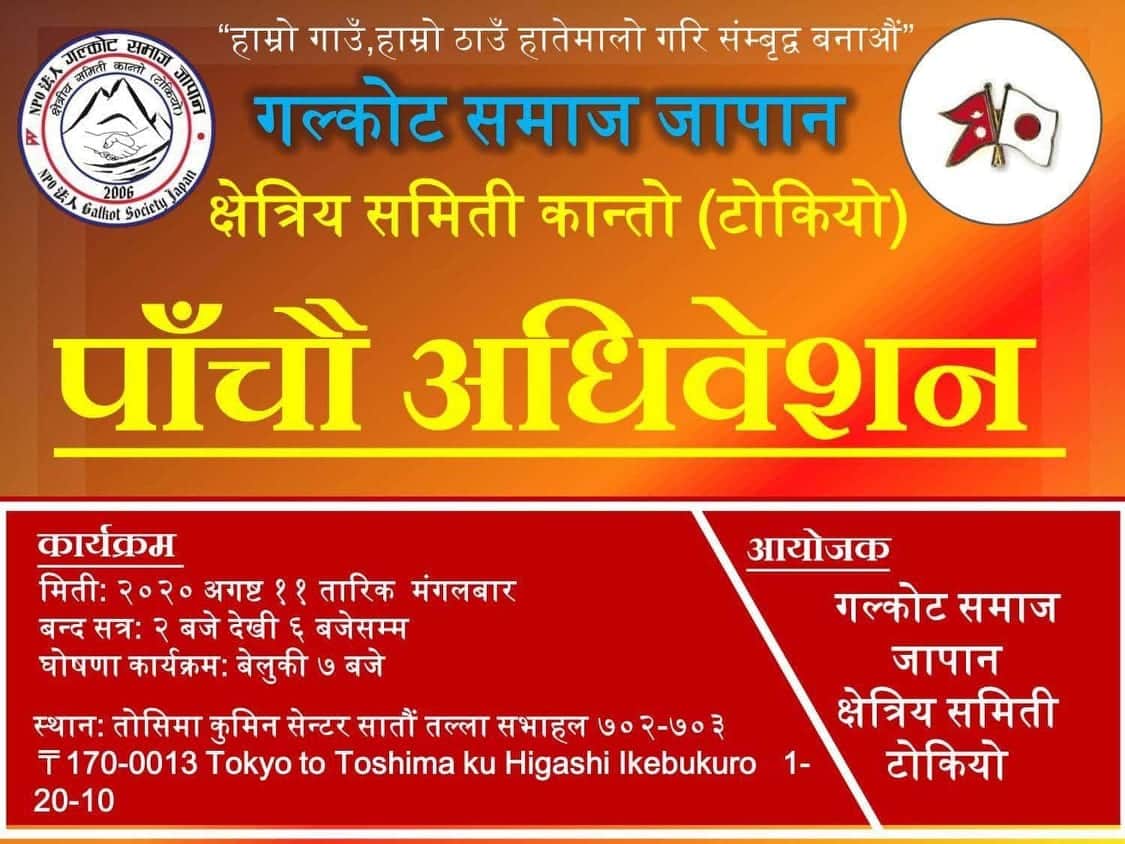 कान्तोका अध्यक्ष महेन्द्र साहानीको अध्यक्षतामा सम्पन्न बैठकमा गल्कोट समाज जापानका संरक्षक एवं अन्तर्राष्ट्रीय गल्कोट समाजका संयोजक बेलुकाजी थापा, गल्कोट समाज जापानका केन्द्रीय अध्यक्ष दिलु खत्री र केन्द्रीय सदस्य किसान बस्नेत समेतको उपस्थिति रहेको थियो । सचिव दुर्गा बहादुर खत्रीको संचालनमा सम्पन्न बैठकमा सम्पुर्ण कार्यसमिति सदस्यहरुले २ बर्षको कार्यकालमा भएका कार्यको समीक्षा र भावी दिनहरुमा समाजलाई दिन सक्ने योगदानका बिषयमा आ-आफ्ना धारणा ब्यक्त गर्नुभएको थियो । बैठकले “गल्कोट समाज कल्याणकारी अक्षयकोष टोकियो २०२०” को अक्षयकोष निर्देशिका जारी गरेको छ । कार्यसमितिको निर्णयबाट हाललाई अक्षयकोषमा ११ लाख रहने गरी कोष संचालन निर्देशिका जारी गरेको छ।हरेक पटक गल्कोट समाज क्षेत्रीय कार्यसमिति पुनर्गठन भएसंगै अक्षयकोष संचालक समिती पनि गठन हुने गरी निर्देशिका जारी गरिएको हो । संस्थाका कोषाध्यक्ष राजु बस्नेतले कार्यसमितिको यस कार्यकालको आय-ब्यय प्रस्तुत गर्नु भएको थियो ।भने सचिव दुर्गा बहादुर खत्रीले प्रगति बिबरण प्रस्तुत गरी सर्वसहमति बाट पारित भएको थियो । बिभिन्न सामाजिक गतिबिधीमा सक्रिय भुमिका निर्वाह गर्ने बर्तमान कार्यसमितिका सदस्य दिनेश थापा, हिमाल कडेल र कृष्ण शर्मालाई क्षेत्रीय कार्यसमितिले “सक्रिय सदस्य सम्मान” प्रदान गर्ने निर्णय पनि बैठकले गरेको छ । केन्द्रीय कार्यसमितिको निर्देशन अनुरूप आगामी ११ तारिक दिउसो १ बजेदेखी ईकेबुकुरो स्थित तोसिमा कुमिन सेन्टरको सातौं तल्लाको सभाहल ७०२-७०३ मा गर्ने तय भएको छ ।