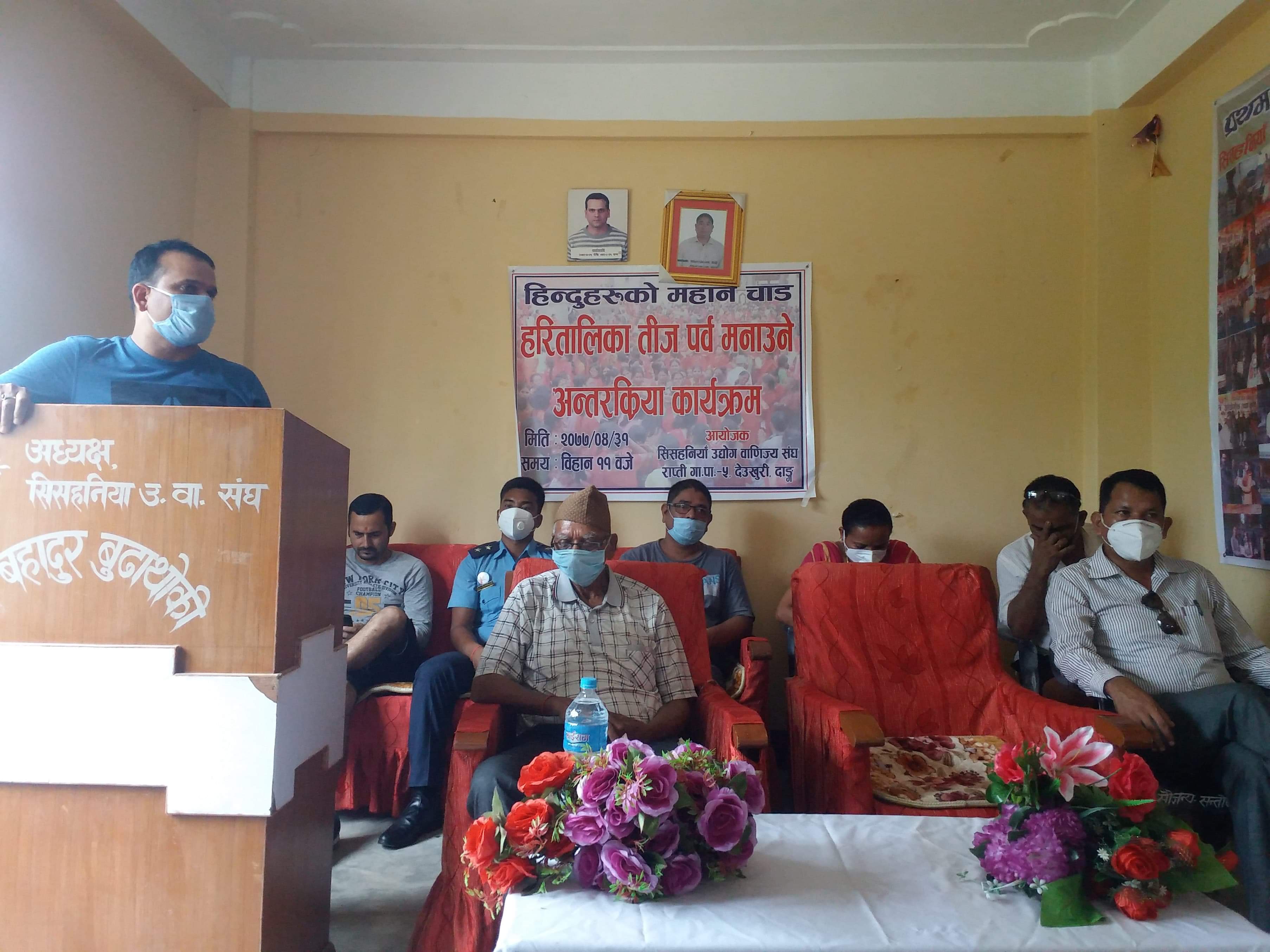 शनिबार सिसहनियाँ उद्योग बाणिज्य संघको अायोजनामा हिन्दुहरूको महानचार्ड हरितालिका तीज पर्व मनाउने विषयमा भएको अन्तरक्रिया कार्यक्रममा सरोकारवालाहरूले सो सुझाव दिएका हुन् । संघका अध्यक्ष शान्तराज भण्डारीको अध्यक्षता एवम् प्रगतिनगर साना शहरी खानेपानी अायोजनाका अध्यक्ष शान्तराज शर्माको प्रमुख अातिथ्यतामा भएको कार्यक्रममा बोल्ने अधिकाशं वक्ताहरूले कोरोना भाइरस संक्रमणका कारण यस वर्षको तीज पर्व घर घरमै बसेर मनाउन महिला दिदीबहिनीहरूलाई अाग्रह गरेका छन् । पछिल्लो समय नेपालीहरुको महत्वपुर्ण चाडपर्ब आईरहेको र कोभिड १९ को जोखीम समेत बढिरहेको भन्दै रातीको समयमा हुने नाचगाना र दिउँसो हुने तीज पर्व र अन्य कुनै पनि कार्यक्रम सञ्चालन नगर्न नगराउन अन्तरक्रिया कार्यक्रम मार्फत अाग्रह गरिएको छ । साथै कार्यक्रमका वक्ताहरूले सुरक्षित रहदै उद्योग ब्यवसाय सञ्चालन गर्न पनि सम्पुर्ण उद्योगी ब्यवसायीहरुलाई अनुरोध समेत गरेका छन् । संघका उपाध्यक्ष युवराजसेन ठकुरीको स्वागत मन्तव्यबाट सुरू भएको कार्यक्रममा ५ नम्बर वडा अध्यक्ष गोवर्धन रावत, नेपाल उद्योग वाणिज्य महासंघ प्रदेश नम्बर ५ का कृषि वन तथा वातावरण समितिका सदस्य ठाकुरप्रसाद सुवेदी, संघका निवर्तमान अध्यक्ष पुर्णबहादुर बुढाथोकी, प्रहरी चाैकी सिसहनियाँका प्रमुख गोपालकुमार मल्ल , कालापानी टोल विकास समितिका अध्यक्ष देवीप्रसाद चाैधरी, रेडक्रसका सदस्य गोविन्द कुवर, पत्रकार ओमप्रकाश गुप्ता, होटल व्यवसायी केवल चाैधरी, प्रगतिशील टोल विकास समितिका अध्यक्ष गंगा केसी, स्वास्थ्य शिक्षा सामुदायिक स्वास्थ्य संस्था हिकोका अध्यक्ष प्रकाश विष्ट, स्वमसेविका श्यामा रावत, राप्ती गाउँपालिका चेम्बरका अध्यक्ष कुमार अधिकारी र संघका प्रेस सल्लाहकार तिर्थराज ज्ञवाली लगायतका वक्ताहरूले शुभकामना मन्तव्य व्यक्त गरेका थिए । कार्यक्रमको सञ्चालन संघका महासचिव ईश्वरीप्रसाद अधिकारीले गरेका थिए ।