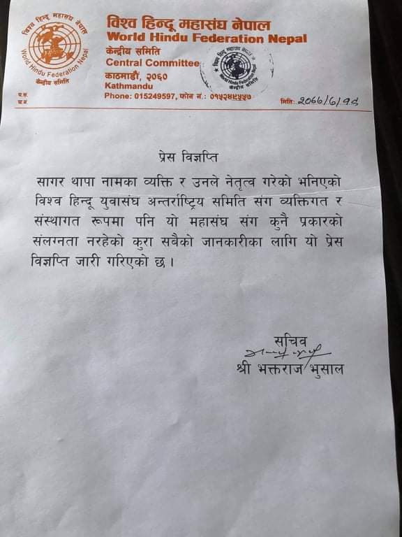 बिश्व हिन्दु महासंघले एउटा बिज्ञप्ति जारी गर्दै थापा बिश्व हिन्दु महासंघको कुनैपनि जिम्मेवारी नभएको स्पष्ट पारेको हो। बिश्व हिन्दु महासंघका सचीव भक्तराज भुसाल द्वारा जारी गरिएको विज्ञप्तिमा भनिएको छ सागर थापा नामका ब्यक्ति र उनले नेतृत्व गरेको बिश्व हिन्दु युवा संघ अन्तरास्ट्रिय समिती सँग रुपमा पनि यो महासंघसँग कुनै प्रकारको संलग्नता नरहेको सबैको जानकारीका लागि यो प्रेस विज्ञप्ति जारी गरिएको छ। सागर थापाले बिश्व हिन्दु युवा संघको नाम बेचेर धेरैलाई ठगेको र चन्दा असुलेको समाचार संचार माध्यममा आएपछि बिश्व हिन्दु महासंघले यस्तो विज्ञप्ति जारी गरेको हो।