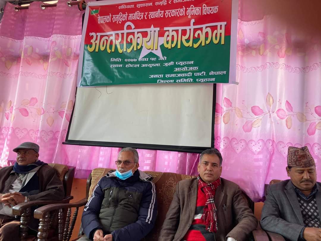 सोमबार, जसपा प्युठानले जुम्रीमा आयोजना गरेको संसद बिघटनको असंबैधानिक कदम र राजनितिक संकटको समाधान बिषयक बृहत अन्तक्रिर्या कार्यक्रमलाई सम्बोधन गर्दै उनले प्रधानमन्त्रीको कदम प्रतिगमन मात्र नभई लोकतन्त्र र संविधान माथिकै प्रहार भएको बताए ।