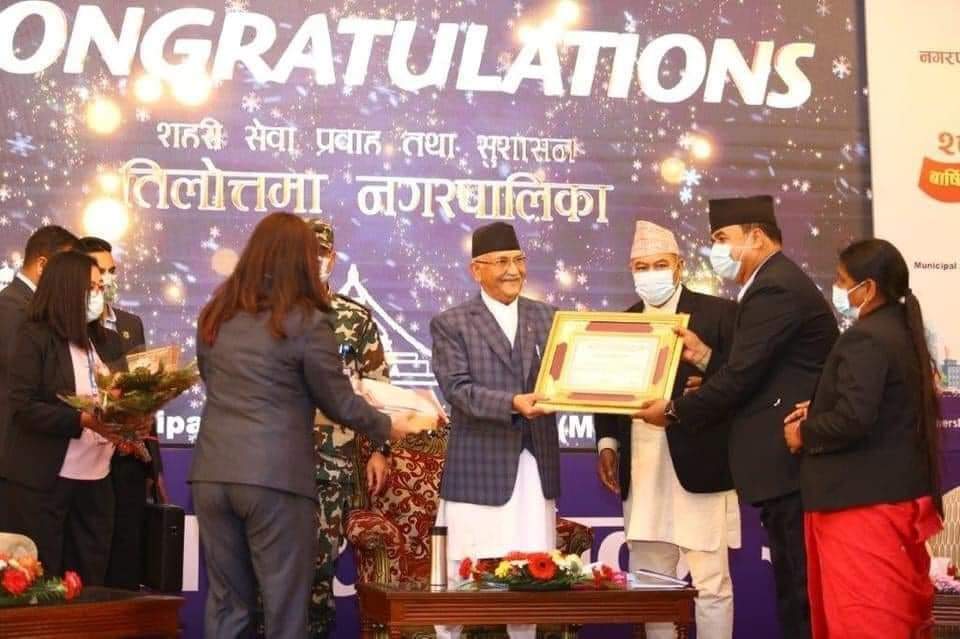 तिलोत्तमा । रुपन्देहीको तिलोत्तमा नगरपालिकाले उत्कृष्ट नगरपालिका पुरस्कार–२०७७ प्राप्त गरेको छ । मुलुकभरका महानगर, उप–महानगर र नगरपालिकाहरुको छाता संगठन नेपाल नगरपालिका संघले सो पुरस्कार प्रदान गरेको हो । आर्थिक वर्ष २०७६÷७७ मा शहरी सेवा प्रवाह तथा सुशासनको क्षेत्रमा उल्लेखनीय कार्यसम्पादन गरेकोले त्यसको उच्च मूल्यांकन गर्दै सो पुरस्कार प्रदान गरिएको संघले जनाएको छ ।