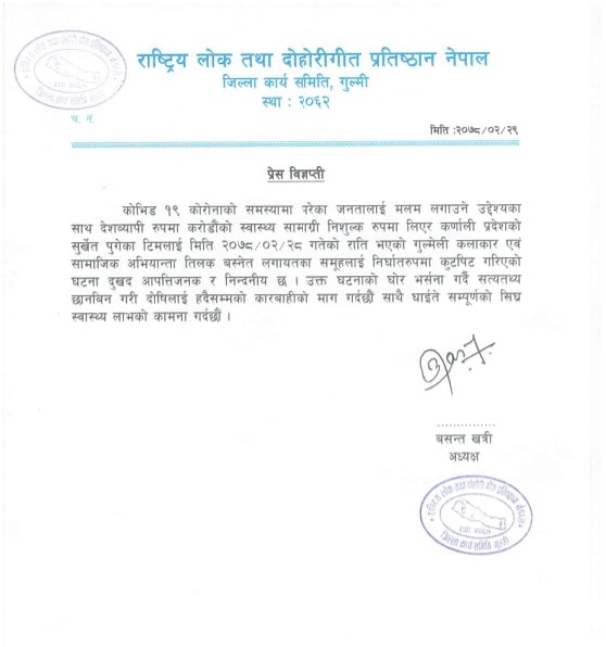प्रतिष्ठान गुल्मीले शनिवार एक बिज्ञप्ती जारी गर्दै कोरोनाको समस्यामा परेका जनतालाई मलम लगाउने उद्देश्यका साथ देशव्यापी रुपमा करोडौंको स्वास्थ्य सामाग्री निशुल्क रुपमा लिएर कर्णाली प्रदेशको सुर्खेत पुगेका टिमलाई निर्घातरुपमा कुटपिट गरिएको घटना दुखद आपत्तिजनक र निन्दनीय भएको जनाएको छ । घटनाको घोर भर्सना गर्दै सत्यतथ्य छानबिन गरी दोषिलाई हदैसम्मको कारबाहीको माग गर्दछौं साथै घाईते सम्पूर्णको सिघ्र स्वास्थ्य लाभको कामना गरेको छ ।