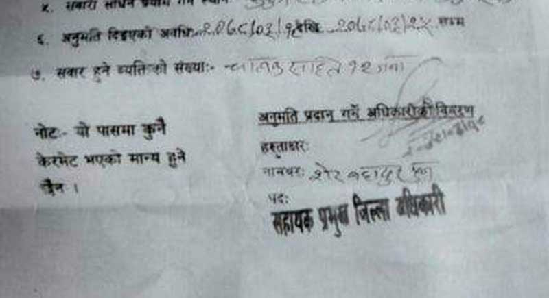 असार १८ गते रुकुम पश्चिमबाट बाँकेको नेपालगञ्ज गएर फेरि रुकुम पश्चिम आउने गरी बनाइएको सवारी पासमा जिल्ला प्रशासन कार्यालयको लेटर प्याड, छापका साथै अनुमति प्रदान गर्ने अधिकारीको हस्ताक्षरसमेत दुरुपयोग गरेको भेटिएको छ ।