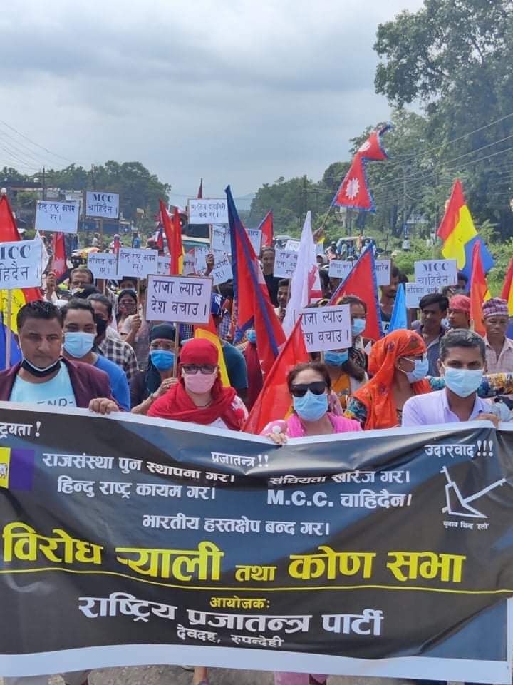 रुपन्देही (देवदह)। रुपन्देहीको देवदहमा राष्ट्रिय प्रजातन्त्र पार्टी (राप्रपा) देवदहले एमसिसि, राजसंस्था पुनस्थापना,भारतीय हस्तक्षेप र महंगी बिरुद्द बृहत बृहत मोटरसाइकल र्याली निकालेको छ। र्यालिमा सहभागीहरुले संघियता खारेज गर, राज संस्था पुन स्थापना,एमसीसी चाहिदैँन,भारतिय हस्तक्षेप बन्द गर जस्ता प्ले कार्ड बोकेका थिए । उनिहरुले एमसीसी राष्ट्रघाती हो भन्दै यो सम्झौता कुनै हालतमा पारित गर्न नहुने नारा लगाएका थिए । देवदहको भलुहीबाट निकालिएको विरोध र्याली घोडाहा हुँदै शितलनगर सम्म मोटर साइकल र त्यस पछि पैदल खैरेनी सम्म बिरोध र्याली गर्दै कोण सभामा परिणत भएको थियो।कार्यक्रममा केन्द्रीय सदस्य तोयानाथ लमसालको प्रमुख आतिथ्यता रहेको थियो।