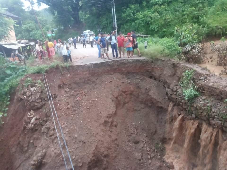 होमपाईप थुनिएर पानीले निकास नपाउँदा पक्की सडक धसिएर करिब ८/१० मिटर तल खसेको छ।सडकको नामोनिशान छैन।पक्की सडकको पुरैभाग भासिएपछि सडक अबरुद्ध भएको हो ।