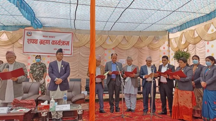 काठमाडौँ । लुम्बिनी प्रदेश सरकारका नवनियुक्त मन्त्रीहरुले पद तथा गोपनीयताको शपथ लिएका छन्।संघ र प्रदेशमा गठबन्धनका दलहरूबीच भागबन्डा मिलेपछि आइतबार सात मन्त्री र ३ राज्यमन्त्रीसहित १० जनाले सपथ लिएका छन् । आइतबार प्रदेश प्रमुख अमिक शेरचनले मन्त्री र राज्यमन्त्रीहरुलाई शपथ गराएका हुन ।
