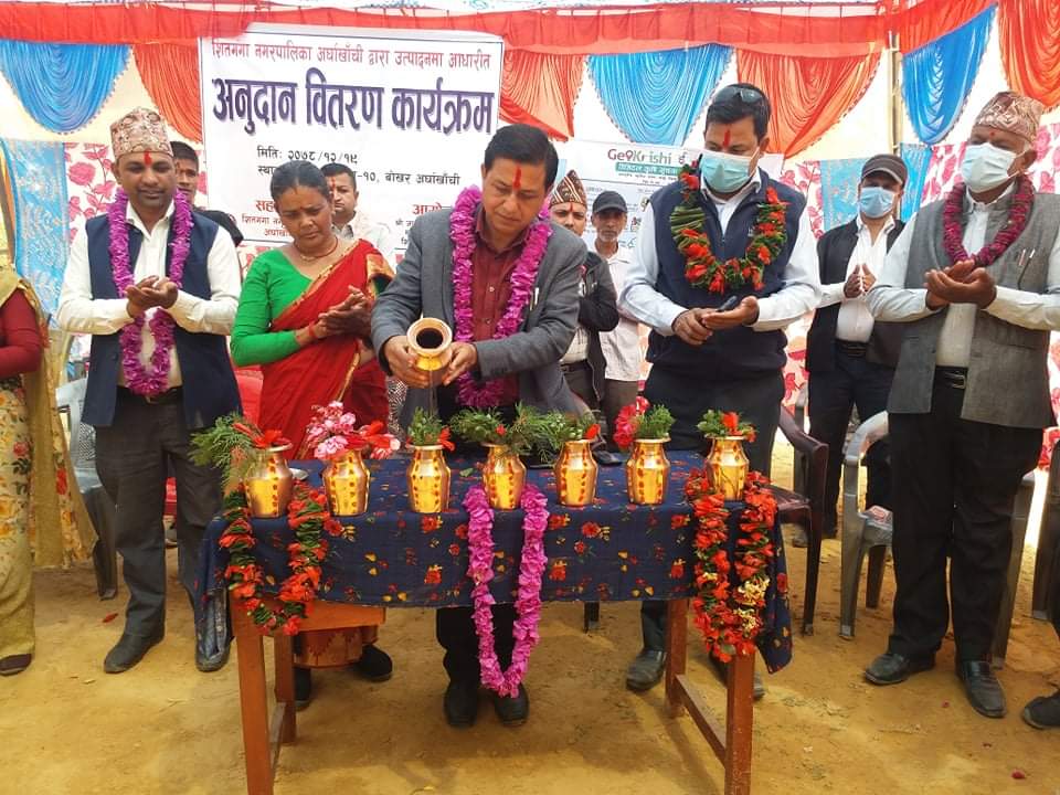 नेत्र मरासिनि,अर्घाखाँची। जागृति कृषि तथा पशु बिकास महिला सहकारी संस्था लिमिटेड शितगंगा नगरपालिका – १० को आयोजनामा शनिबार ४६ जना उत्कृष्ट उधमिहरुलाई रु ४ लाख ७० हजार ४७१ रुपैया उत्पादनमा आधारित अनुदान वितरण गरिएको छ । सितगंगा नगरपालिका अर्घाखाँचीद्वारा आर्थिक बर्ष २०७७/०७८ को कार्यक्रम अन्तर्गत कृषि तथा पशु तर्फको क्षेत्रमा सहकारी मार्फत बैज्ञानिक तरिकाबाट तौल गरि बिक्रि गर्ने कृषकहरुलाई उक्त रकम वितरणबाट गरिएको हो। उक्त कार्यक्रममा सितगङा नगर प्रमुख सुर्य प्रसाद अधिकारीले साना किसानहरुको मुहारमा हासो र खुसी तथा हौसला प्रदान गर्नका लागि नेपालमै नौलो तरिकाबाट उधमीको हात हातमा सहकारी मार्फत नगद प्रदान गरिएको बताउनु भयो । साना किसानहरुलाई माथी नउकासी नगरबासीको समृद्धि नहुने बताउदै उहाले जहिले पनि किसानको साथ र सहयोगमा कार्यक्रम सन्चालन गरेको बताउनु भयो । उक्त कार्यक्रममा सितगङा नगरपालिका १० का वार्ड अध्यक्ष हिम्मत पोख्रेल , कार्यपालिका सदस्य शान्ता अधिकारी , हेफर/ ईपिसिडिसी अर्घाखाँचीका परियोजना संयोजक केसब भुसाल , नेत्र मरासिनी , जनजागृती माविका प्राचार्य रोमाखर बन्जाडे लगायतले शुभकामना मन्तब्य राख्नु भयको थियो । हाल सम्म नगरपालिकाको तर्फबाट आर्थिक बर्ष ०७५/०७६ देखि आर्थिक बर्ष ०७७/०७८ सम्म २ हजार १ सय जना बढी उत्कृष्ट उधमीहरुलाई रु २ करोड भन्दा बढि रकम प्रदान गरिएको छ ।