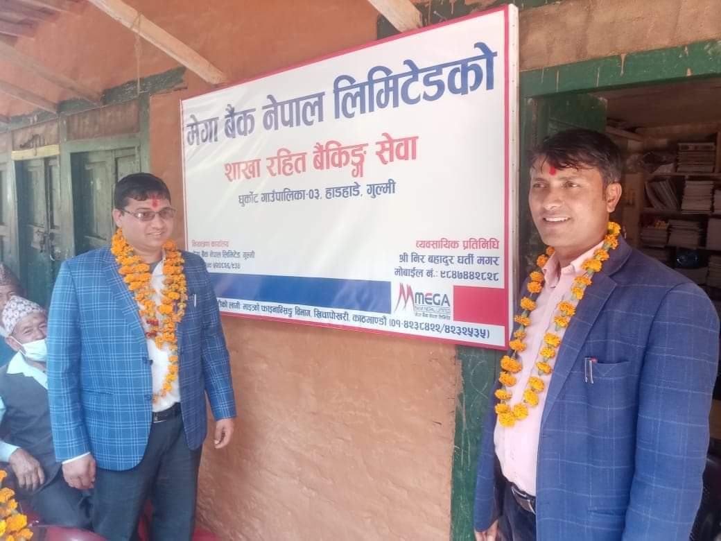 अनिल खत्री, गुल्मी । मेगा बैंक नेपाल लिमिटेडले गुल्मी जिल्लाको धुर्कोट गाउँपालिकामा शाखा रहित बैंकिङ्ग सेवाको शुरुवात गरेको छ । ग्रामीण क्षेत्रका वासिन्दाहरुलाई बैकिङ्ग पहुँच विस्तार गर्ने उद्धेश्यले धुर्कोट गाउँपालिकाको वडानम्बर–३ हाडहाडेमा शाखा रहित सेवाको विस्तार गरिएको मेगा बैंक तम्घास शाखा प्रमुख कालिदास पाण्डेले बताए ।