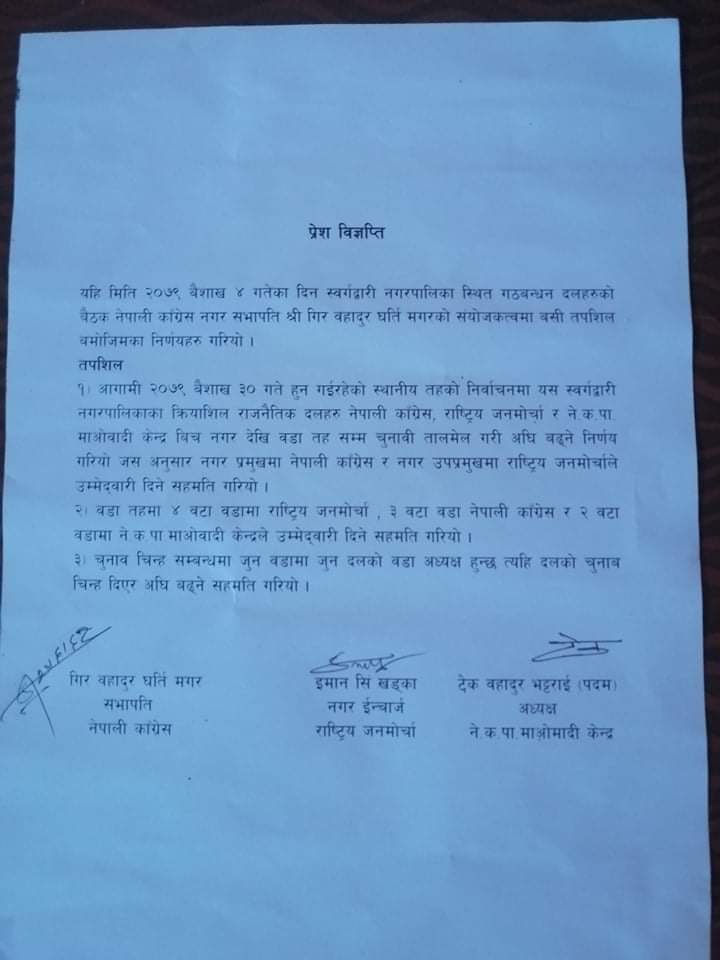 सत्ता गठबन्धनले संयुक्त रुपमा प्रेस बिज्ञप्ती जारी गर्दै नगर देखि वडा तह सम्म नै चुनावी तालमेलका लागि भागबण्डा टुङ्गो लगाईएको जानकारी दिएका छन।