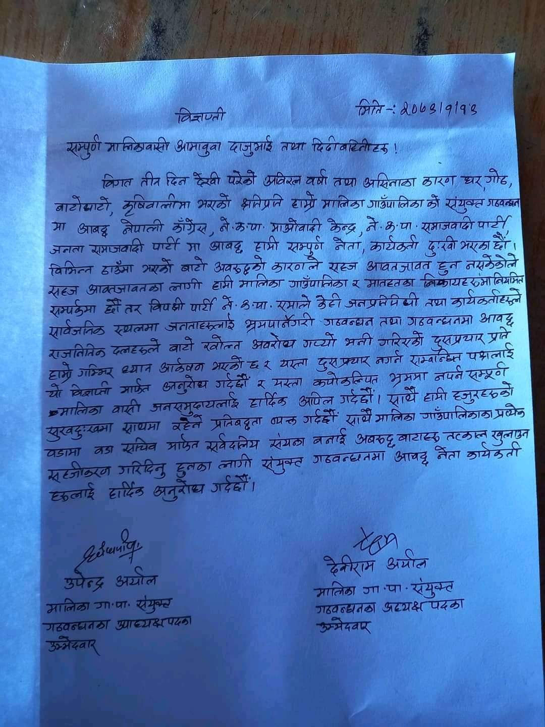 गठबन्धनका अध्यक्ष पदका उम्मेदवार देविराम अर्याल र उपाध्यक्ष पदका उम्मेदवार उप्रेन्द्र अर्यालद्धारा हस्ताक्षरित बिज्ञप्तीमा विभिन्न ठाउँमा भएको बाटो अवरुद्धको कारणले सहज आवतजावत हुन नसकेकोले सहज आवतजावतका लागी हामी मालिका गाउँपालिका र मातहतका निकायहरुमा नियमित सम्पर्कमा रहेको उल्लेख गरेका छन् । गठबन्धनका उम्मेदवारहरु एमाले केही जनप्रतिनिधी तथा कार्यकर्ताहरुले सार्वजनिक स्थलमा जनताहरुलाई भ्रमपार्नेगरी गठबन्धन तथा गठवन्धनमा आवद्ध राजनितिक दलहरूले बाटो खोल्न अवरोध गप्यो भनी गरिएको दुस प्रचार प्रति हाम्रो गम्भिर ध्यानकर्षण भएको उल्लेख गरेका छन् ।