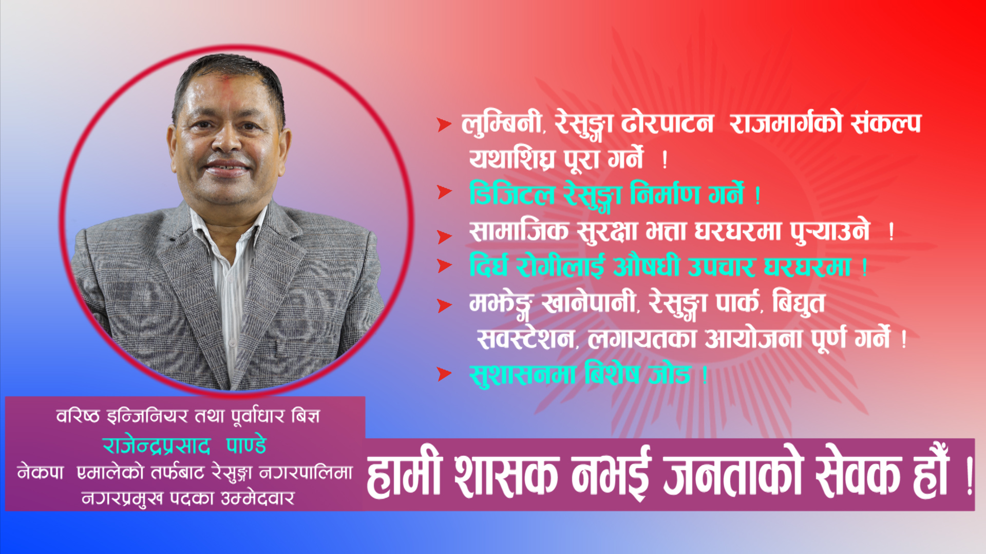 गुल्मी । गुल्मी जिल्लाको रेसुङ्गा नगरपालिकामा नेकपा एमालेको तर्फबाट उम्मेदवार नगरप्रमुखको उम्मेदवार बनेका बरिष्ठ ईन्जिनियर राजेन्द्र प्रसाद पाण्डेय उम्मेदवारीसँगै नगर वासीहरुम उत्साह देखिएको छ । उनले स्थायी कर्मचारीको रुपमा ३२ वर्ष ४ महिना इन्जिनियरको क्षेत्रमा अनुभव संगालेका छन्।