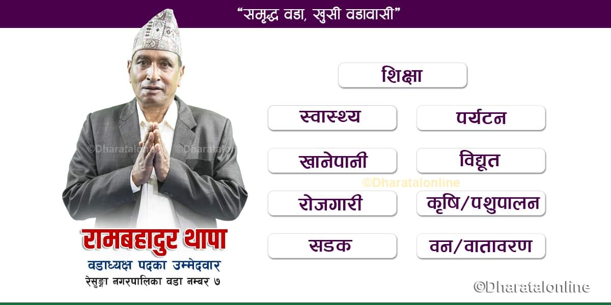 कर्मचारी क्षेत्रमा रहेर बिभिन्न ठाउँमा आफुले गरेका कामको अनुभवलाई आफनै वडामा निर्वाचित भएका काम गर्ने अठोट लिएर वडाअध्यक्ष पदमा उम्मेदवार बनेको थापाले बताए । रेसुङ्गा नगरपालिका वडानम्बर–७ लाई बदल्ने प्रमुख संकल्पहरुमा देउराली, कमेरपानी, कुडापानी, सिस्नेहार वर्दवासको स्तारोन्नति गर्दै कालोपत्रे गर्ने काम क्रमागत रूपमा भएको हुदाँ निरन्तरता दिई सम्पन्न गर्ने लक्ष्य रहेको छ।