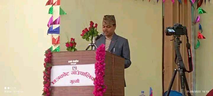 टोपराम केसी,गुल्मी । गुल्मीको छत्रकोट गाउँपालिकाले आगामी आर्थिक वर्ष २०७९/०८० का लागि नीति तथा कार्यक्रम हिजो सार्वजनिक गरेको छ।गाउँपालिकाले स्वास्थ , शिक्षा, कृषि, पुर्वाधार,सुशासन सहितको समृद्ध छत्रकोट हाम्रो आधार भन्ने मुल नाराका साथ विभिन्न क्षेत्रलाई प्राथमिकीकरणका आधारमा नीति तथा कार्यक्रम सार्वजनिक गरेको जनाएको छ। गाउँपालिका अध्यक्ष राम प्रसाद पाण्डेयले नीति तथा कार्यक्रम प्रस्तुत गर्नु भएको हो।नीति तथा कार्यक्रम प्रस्तुत गर्दै अध्यक्ष पाण्डेयले छत्रकोटको वास्तविक सपना पूरा गर्न सवैको साथ र सहयोग हुनु पर्नेमा जोड दिनु भयो।