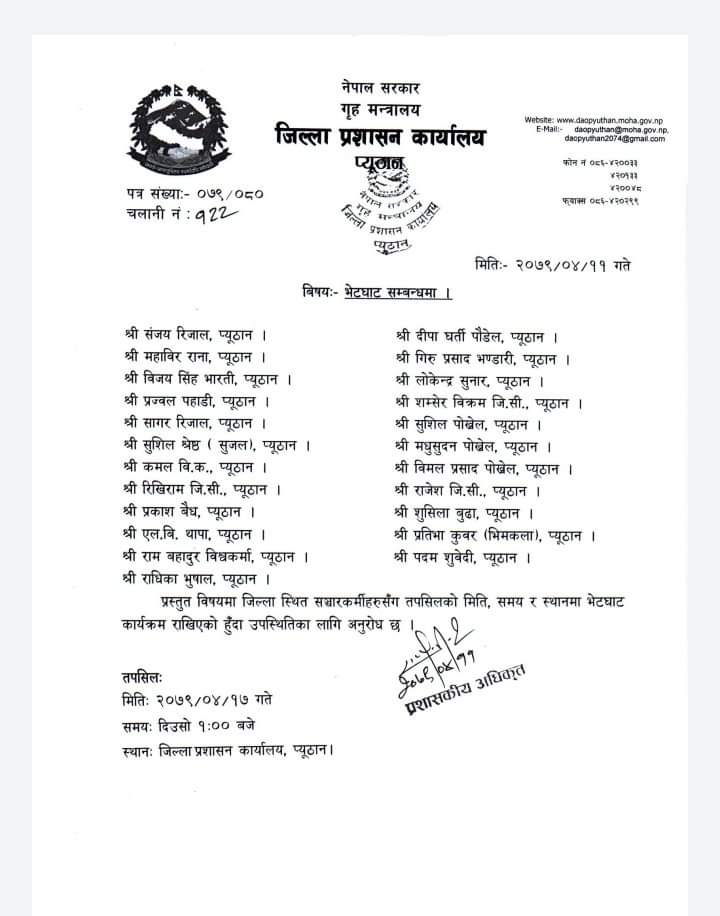 साउन १७ गते जिल्ला प्रसाशन कार्यालयद्वारा आयोजना गर्न लागिएको पत्रकार भेटघाट कार्यक्रमको लागि २३ जना पत्रकारको नामनै तोकेर पत्राचार गरेको छ।