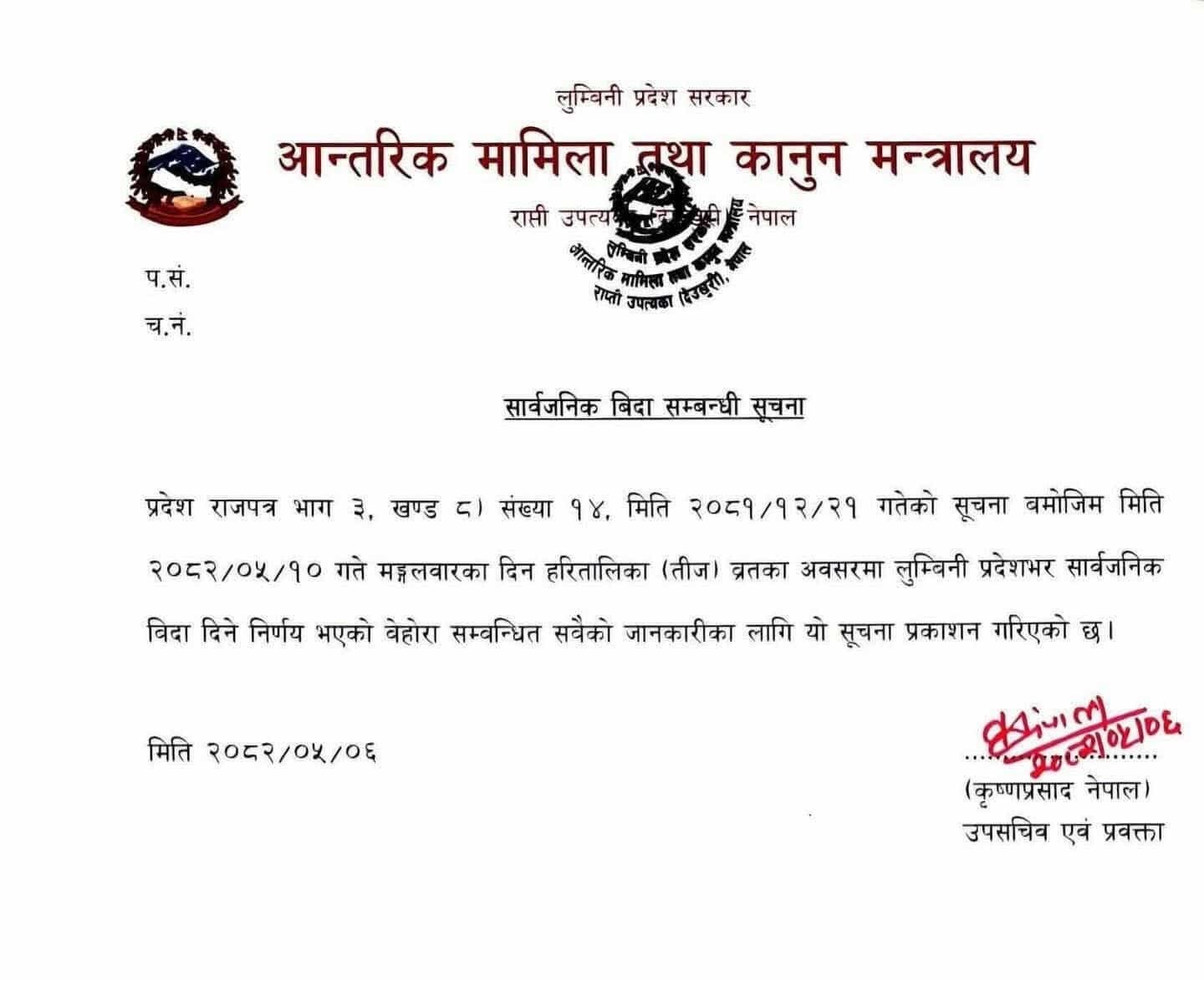 हरितालिका तीजमा लुम्बिनी प्रदेशमा सार्वजनिक बिदा